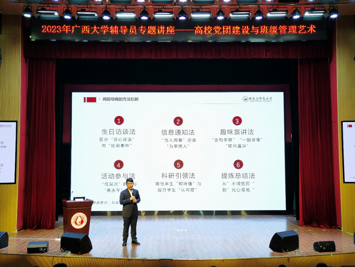 11月30日上午,哈尔滨师范大学融媒体中心主任、传媒学院辅导员、2021年全国最美高校辅导员刘国权受邀到校,为太阳集团2138全体辅导员作题为“高校党团建设与班级管理艺术”的专题讲座。