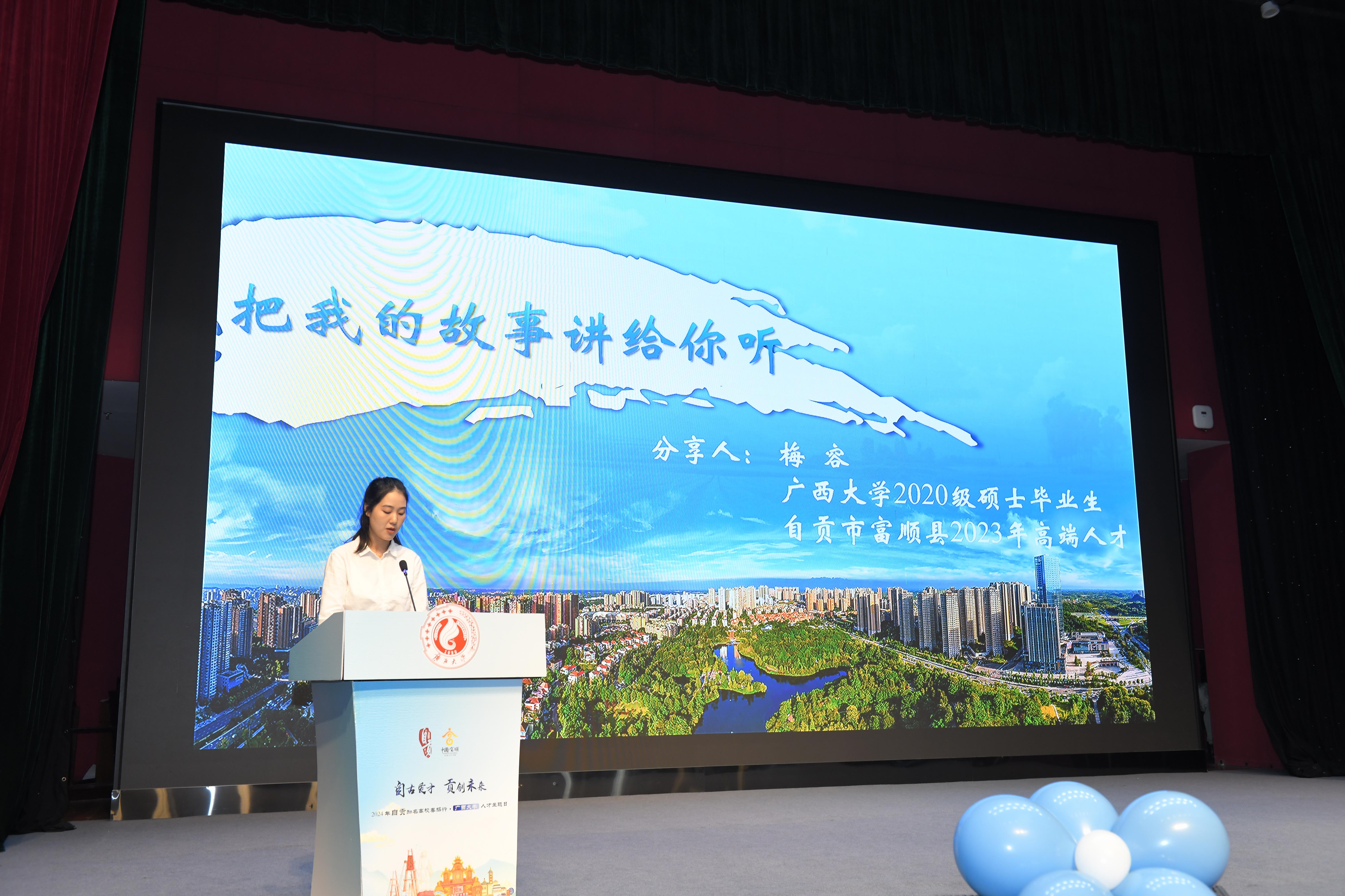 太阳集团21382023届校友、自贡市高端人才代表梅容为同学们作了题为“把我的故事讲给你听”的招聘宣讲,分享了选择自贡的经历、在自贡工作生活的感受并向师弟师妹们发出邀请。