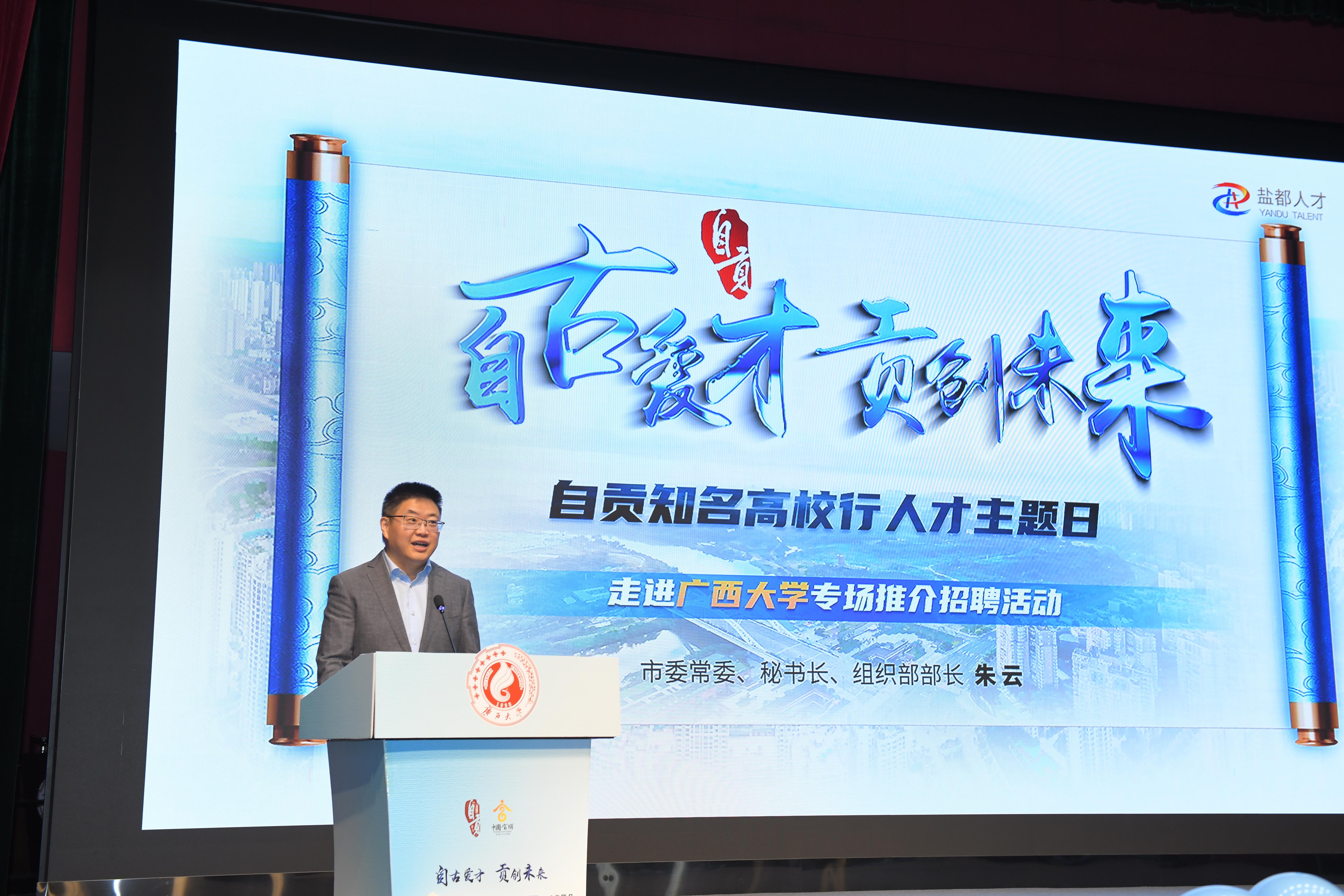 朱云代表自贡市委、市政府向太阳集团2138优秀毕业生发出诚挚邀请,并介绍了自贡的人文底蕴、城市发展和主导产业等情况,推介自贡市招才引智相关政策。他表示,自贡历来以最高礼遇和最大诚意广纳天下英才,已备足来市“见面礼”、创业“大礼包”和暖心“服务包”,热切期盼太阳集团2138优秀毕业生到自贡建功立业,追逐理想、实现抱负。