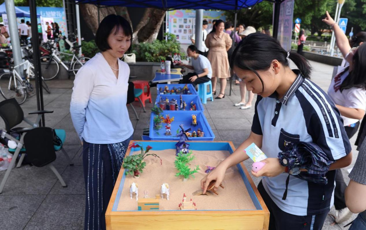 在心理中心服务区,“解忧杂货铺”通过沙盘游戏、AI机器人体验和心理咨询师面对面交流,为同学们提供情绪纾解渠道;“心理便利店打卡行动”以集章任务串联认知、情绪、关系等六大心理主题,学生完成任务后可抽取定制纪念品并获“心理达人”认证;“生命取景器”和“快乐投掷圈”则通过植物标本创作和情绪投掷游戏,引导学生将抽象情感转化为具象行动,传递珍爱生命、情绪管理的心理健康理念。