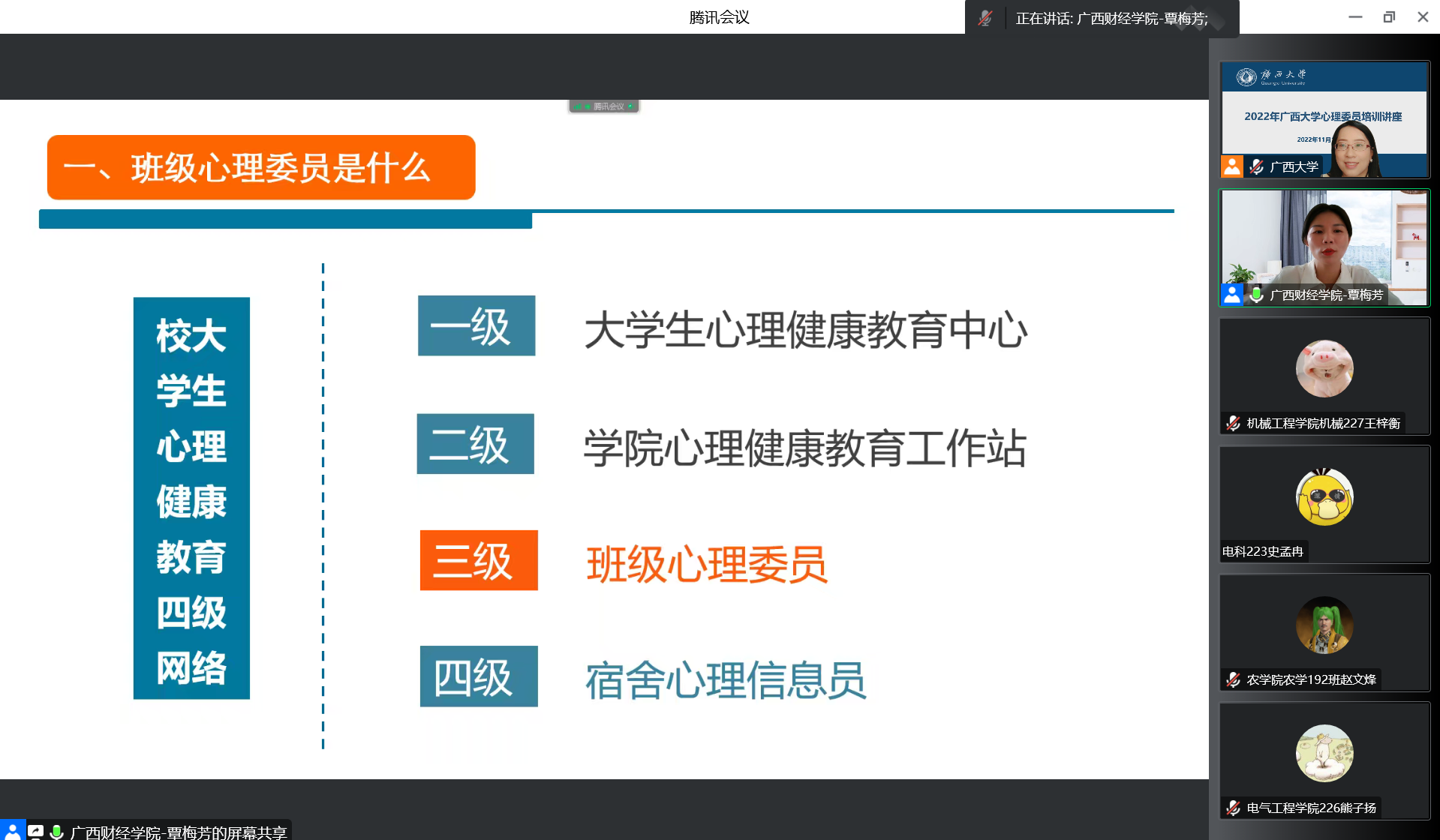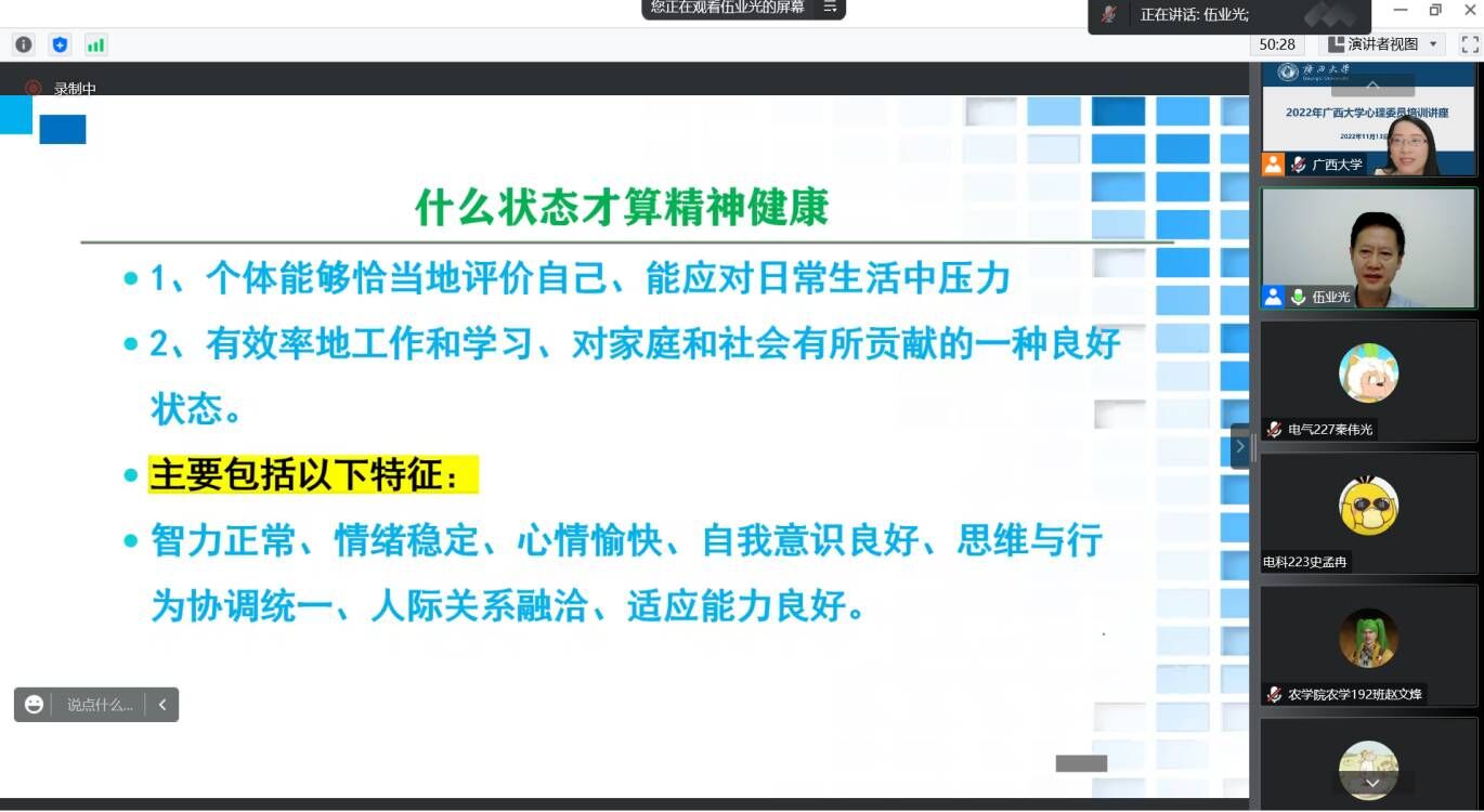 11月13日上午,学生工作处心理发展指导中心开展了线上班级心理委员培训讲座,南宁市社会福利医院主任医师、教授、硕士生导师伍业光和广西财经学院心理健康教育与咨询中心副主任、副教授覃梅芳主讲,470余名班级心理委员参与了线上讲座。