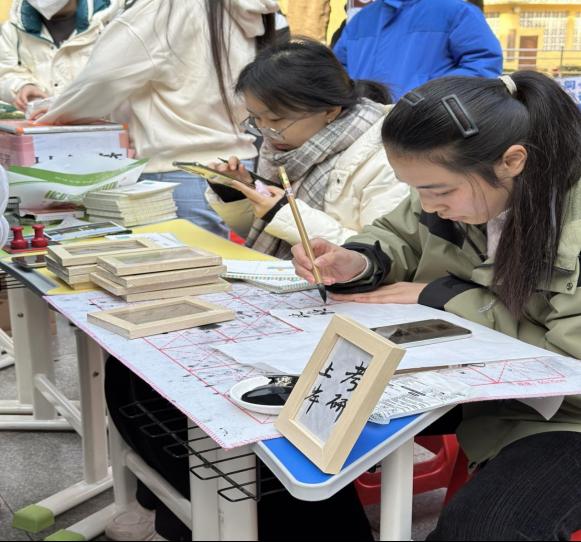 活动现场书画协会的同学们挥毫泼墨,书写出一张张精美的明信片和考试祝福语,寄语同学们在即将到来的考试中取得好成绩。