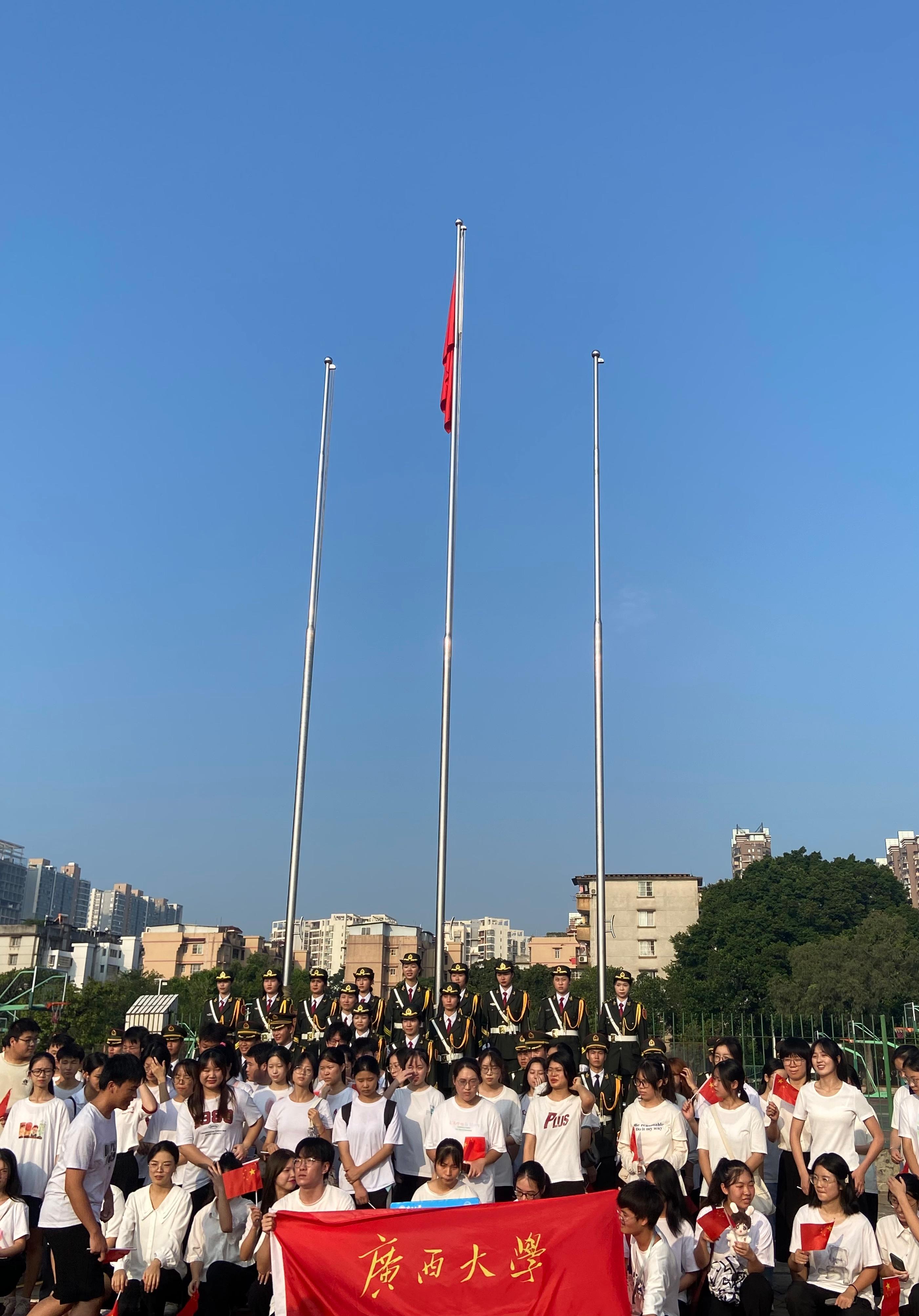 上午8时,升国旗仪式正式开始。国旗护卫队迈着坚定有力的步伐护送国旗至升旗台,擎旗手迎风振臂,熟练有力地将国旗向空中展开。伴随着激越昂扬的《义勇军进行曲》响起,全体师生向冉冉升起的五星红旗肃立致敬,齐唱国歌,表达对伟大祖国的无限敬意和深深祝福。