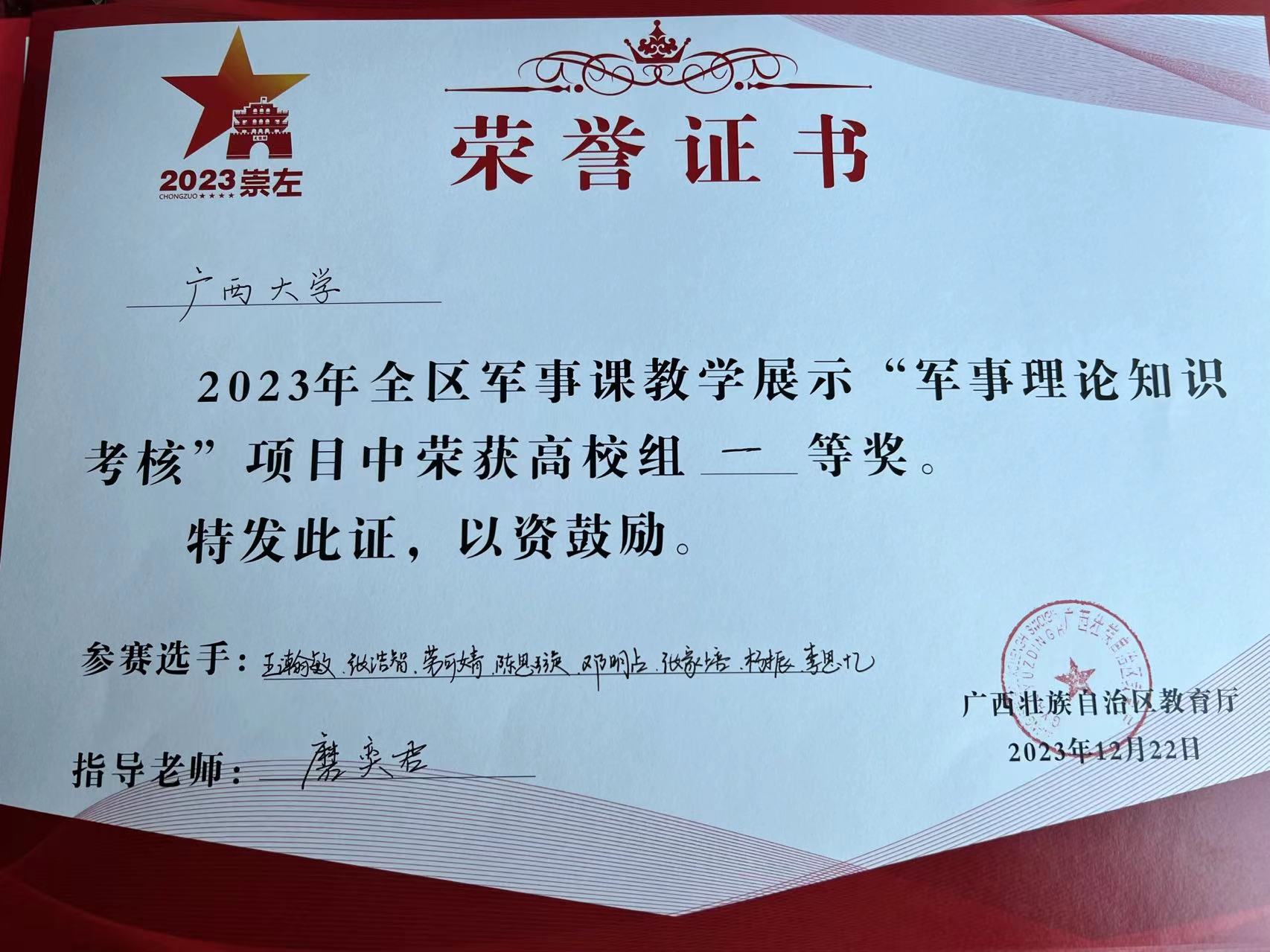 12月21日,由自治区教育厅主办的2023年全区军事课教学展示活动在桂林理工大学南宁分校落下帷幕。经过激烈角逐,太阳集团2138代表队分别斩获一等奖1项、二等奖4项、三等奖3项的好成绩,并荣获高校组综合二等奖。