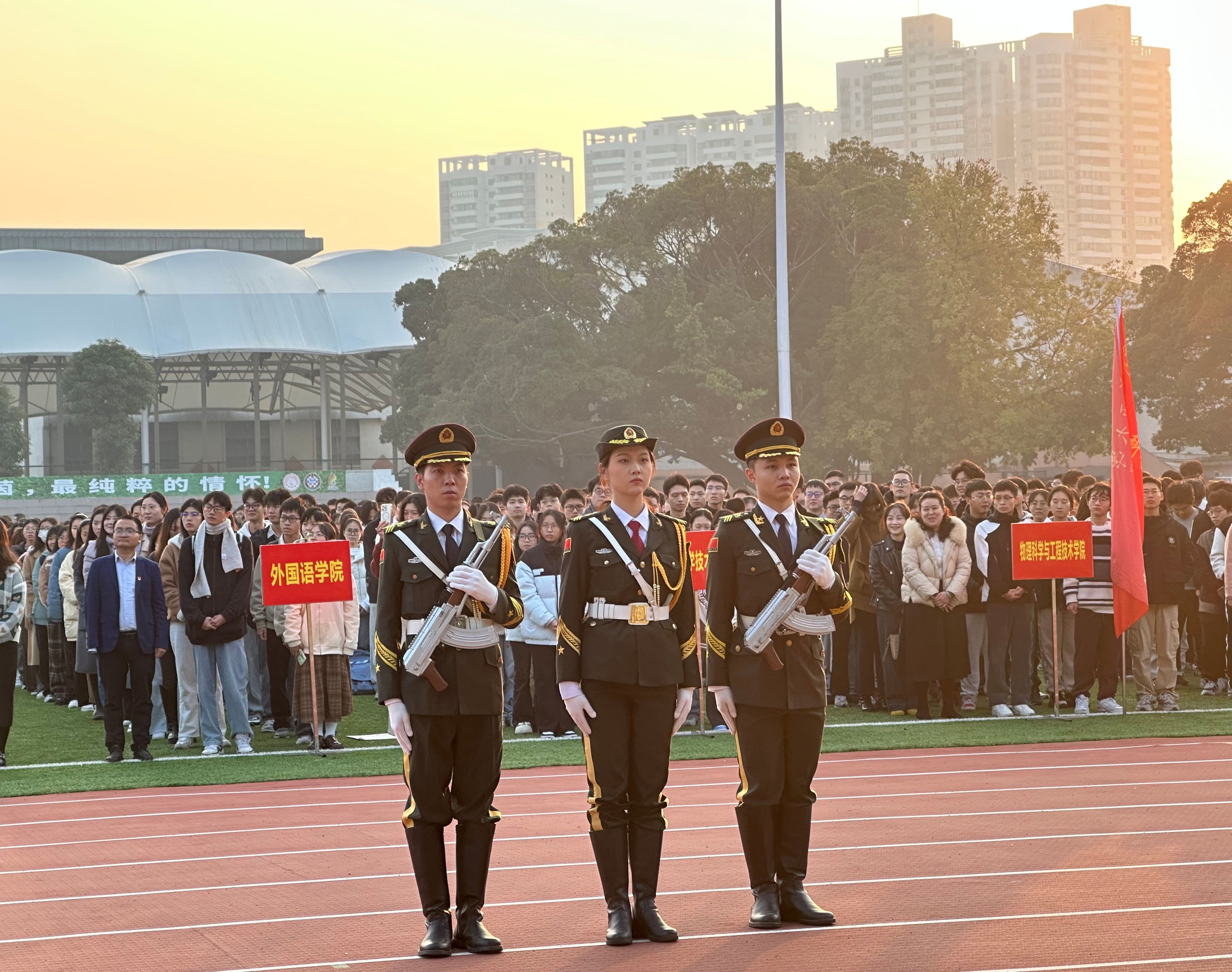 1月1日,太阳集团2138在西校园田径场举行元旦升旗仪式。各学院4000余名师生代表齐聚,迎接新年的第一缕曙光,开启新岁华章。