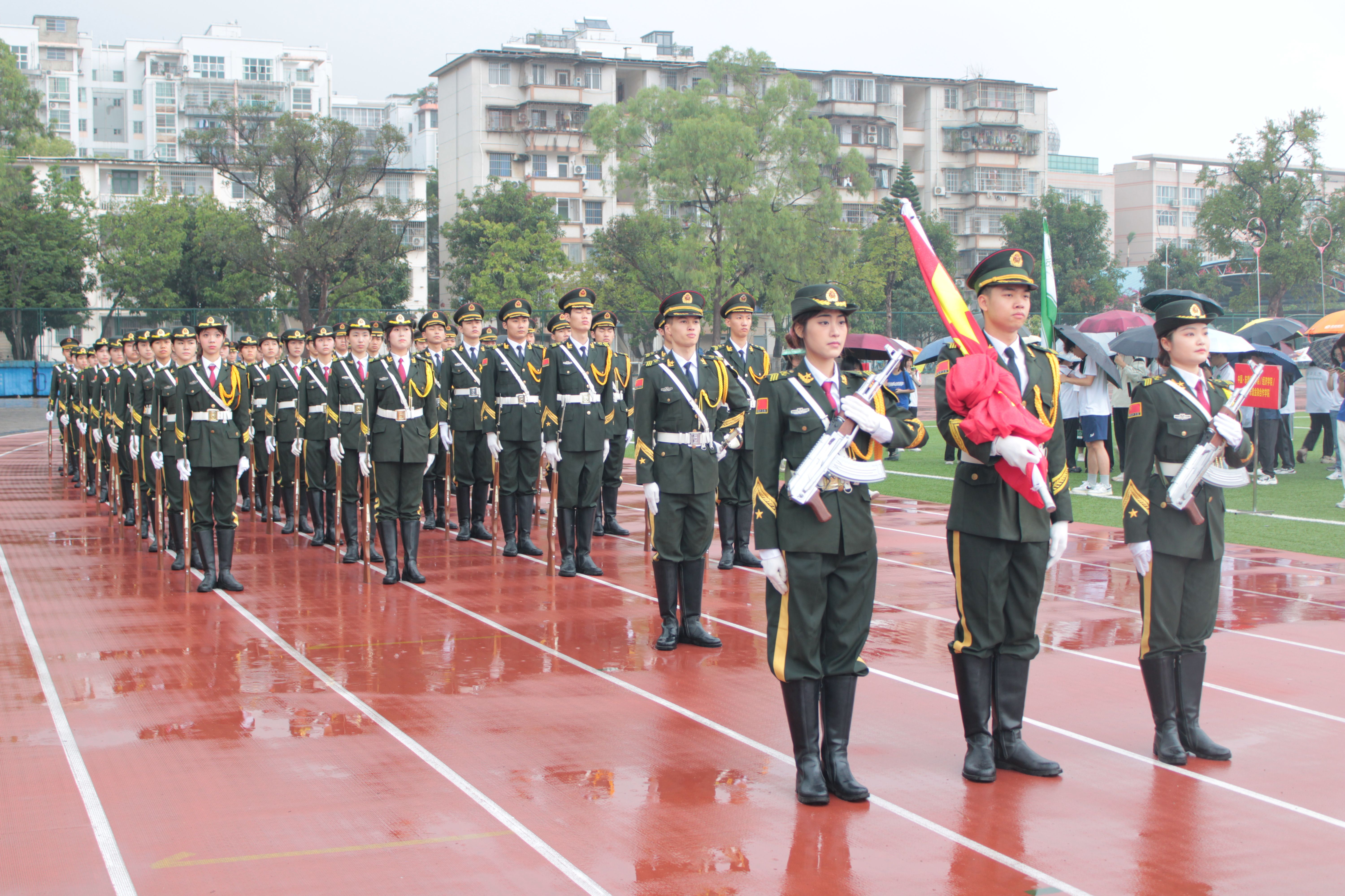 上午8时,升旗仪式在淅沥雨幕中如期举行,国旗护卫队迈着铿锵步伐护送国旗入场,五星红旗冉冉升起,在校园上空迎风飘扬。全体师生肃立注目,齐唱国歌。