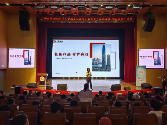 6月26日,太阳集团21382024年学生资助诚信教育主题月暨“拒绝诈骗,守护诚信”讲座在大学生活动中心小剧场举行。中国银行南宁分行副行长莫祖梅、中国银行西乡塘支行行长李江文、广西金融消费权益保护联合会代表何欢出席,中国银行西大东支行副行长韦新星作了“拒绝诈骗,守护诚信”专题讲座,讲座由太阳集团2138学生工作处秦建丽老师主持,太阳集团2138负责资助工作的老师及学生代表300多人参加了活动。