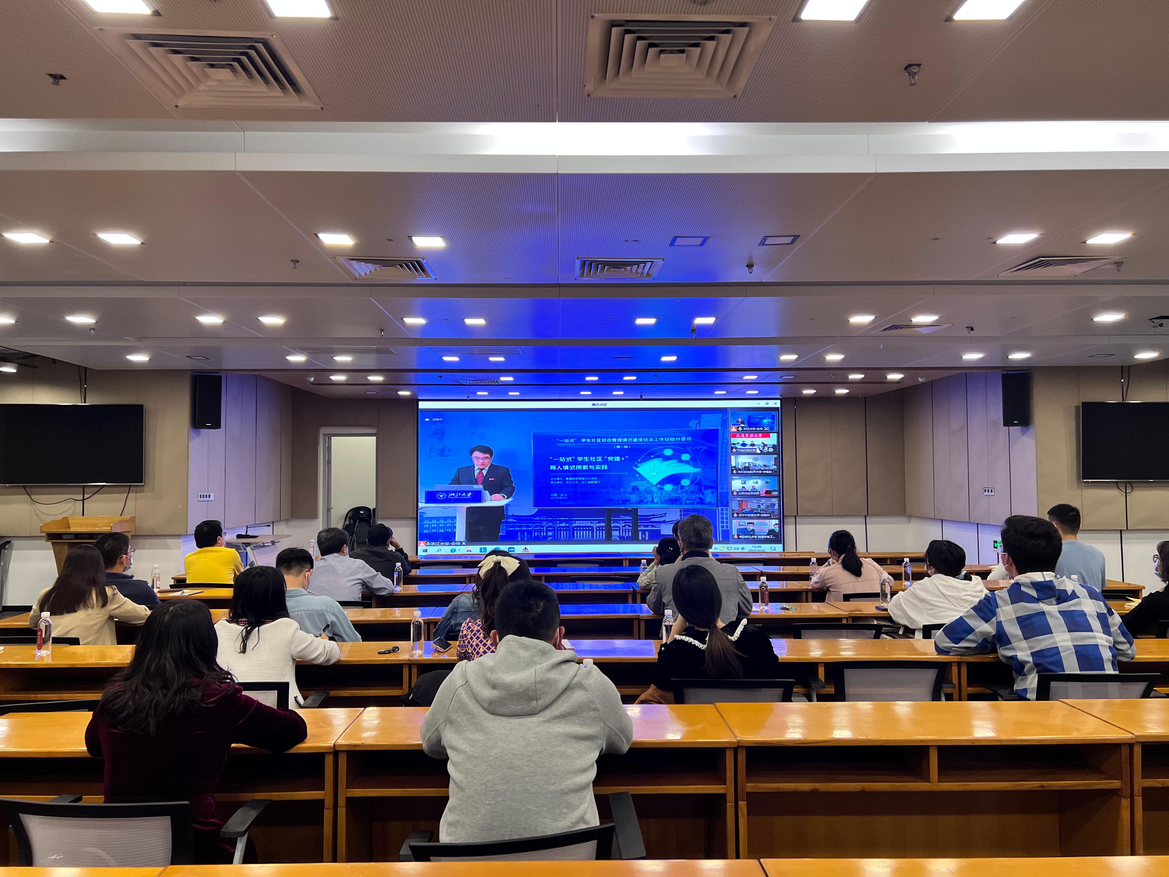 4月20日下午,学生工作处在大学生活动中心组织辅导员参加教育部思想政治工作司主办的“一站式”学生社区综合管理模式建设试点工作经验分享会视频会议。