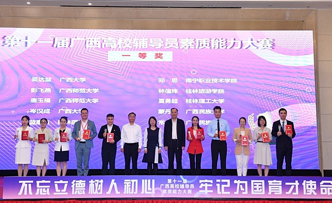 5月12至14日,由自治区教育厅主办,教育部高校思想政治工作队伍培训研修中心(广西师范大学)承办的第十一届广西高校辅导员素质能力大赛在桂林举办,共有来自全区各高校的84名专职辅导员参赛。经过三天激烈角逐,太阳集团2138资源环境与材料学院辅导员吴达慧以总分第一名、工商管理学院辅导员岑汉成以总分第四名,双双获大赛一等奖,并分别获“最佳表现奖”。